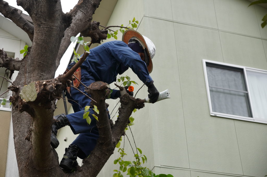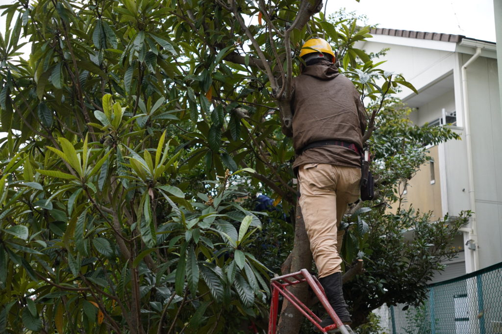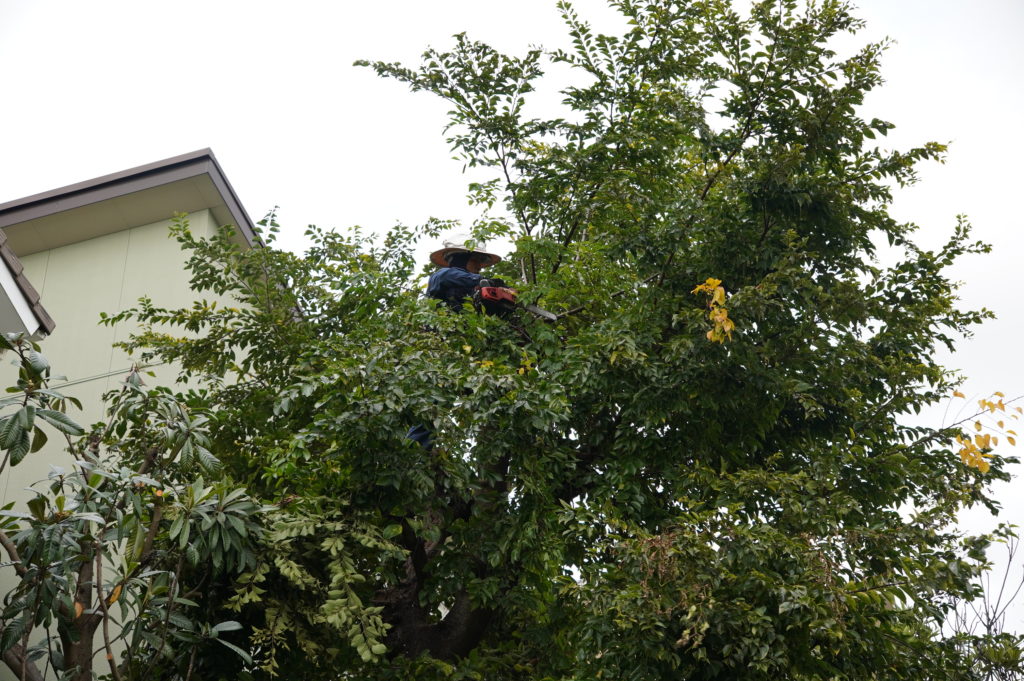 脚立に登りどんどん枝を切落していく職人さんたち。生い茂る葉に埋もれてしまっていますが、どうやって切る枝を見極めているのでしょうか。