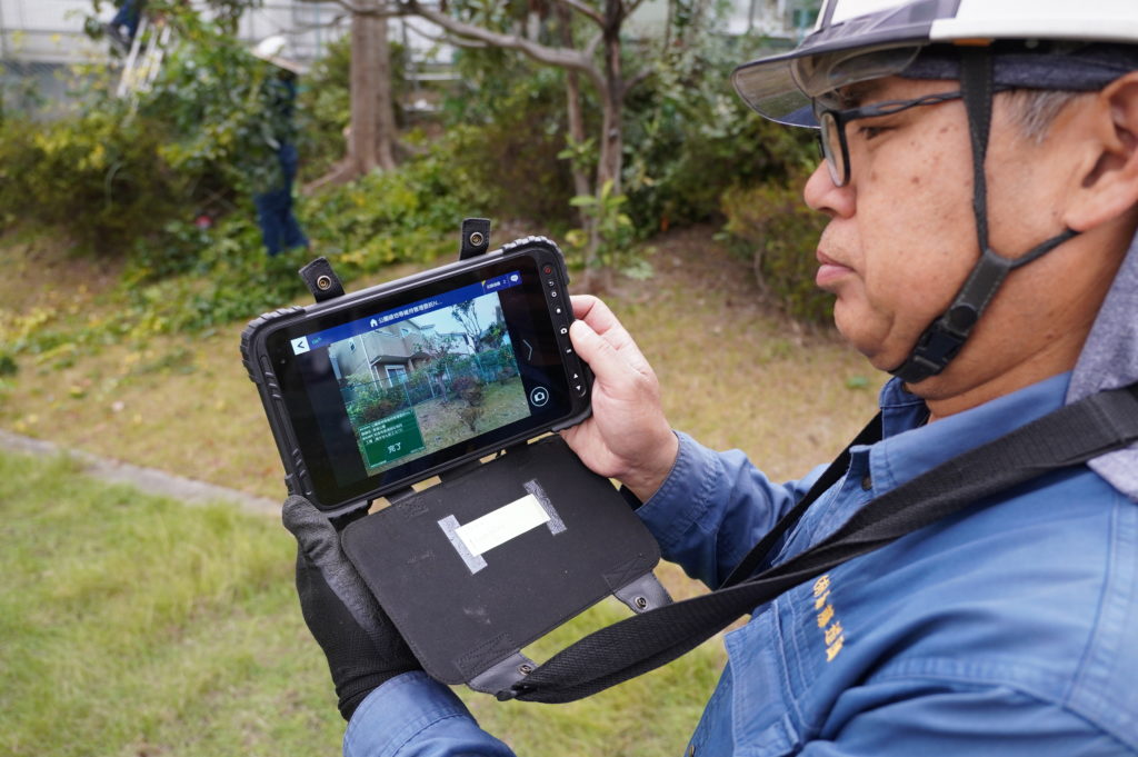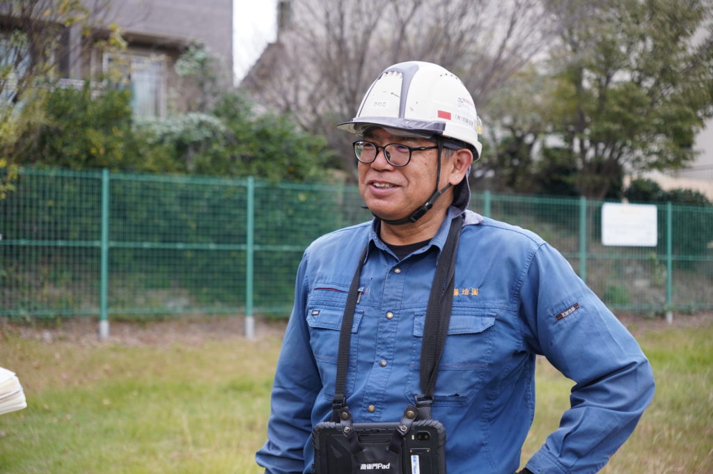 「木の種類によって切り方があるのと事前に完成イメージを伝えてあるので、俯瞰で見れなくてもどこをどう切ればいいか感覚で分かっているんです。」と教えてくれたのは現場で指揮をとる施工管理の河田さん(50代)。