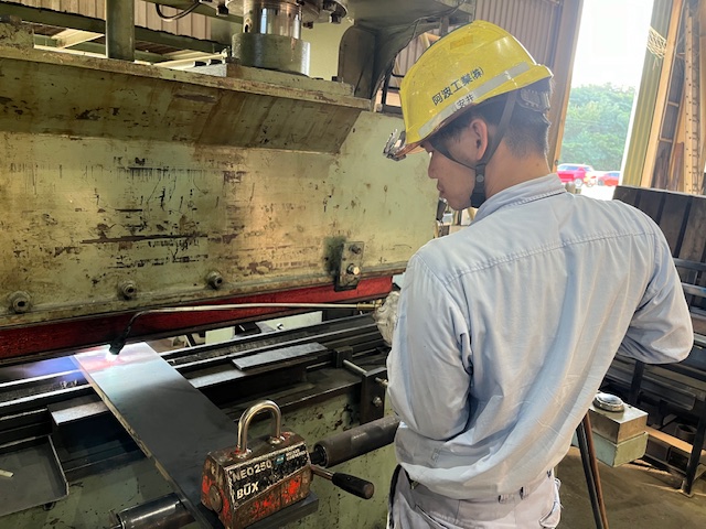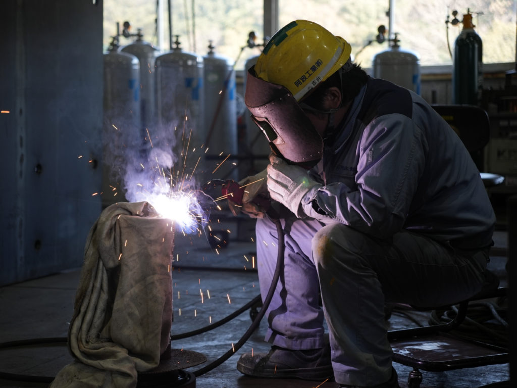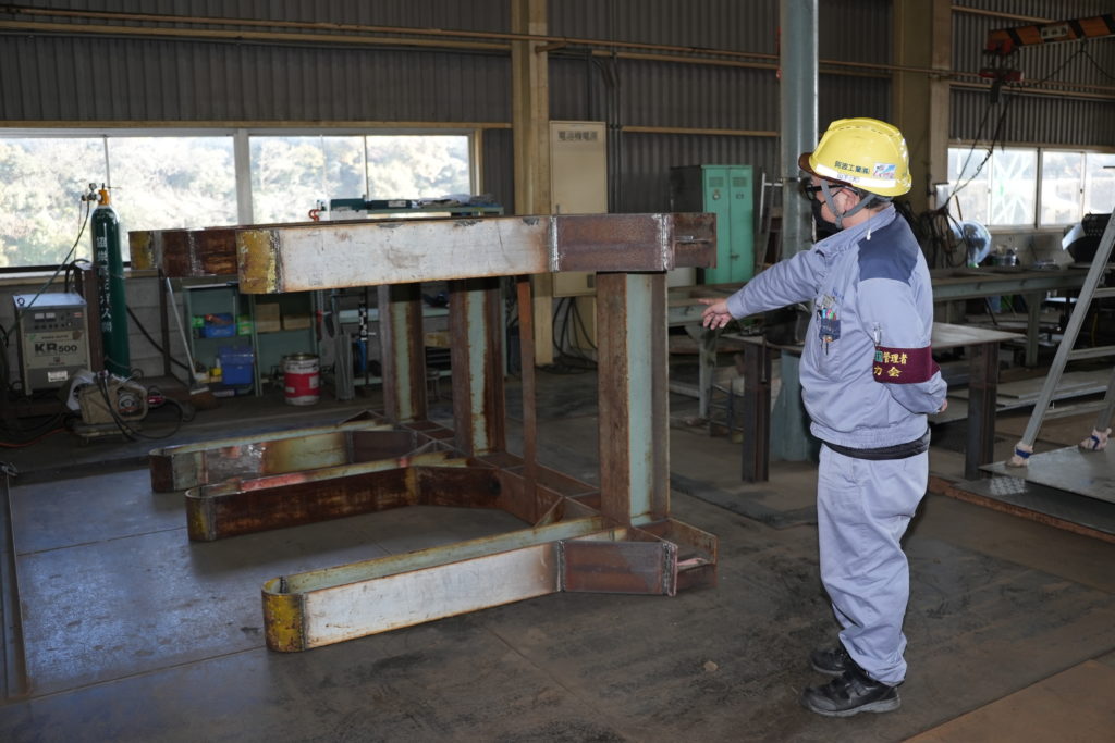 阿波工業㈱はJFEスチール㈱の協力会社として昭和39年に創業しました。現在は拠点が2つあり、ひとつはJFEスチール構内で鋼管(=鉄パイプ)製造ラインのオペレーターの請負業務、もうひとつが武豊町の自社工場で鋼鉄製品の製作や加工業務を行っています。