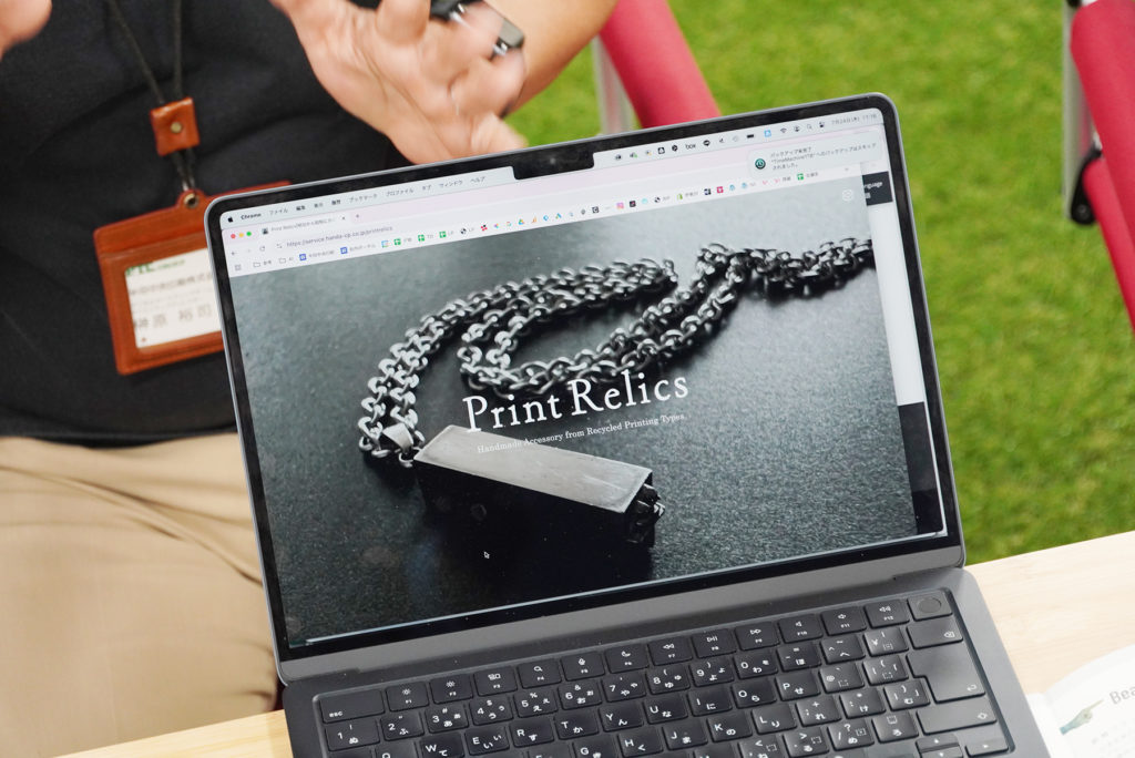 続いてはオリジナルアクセサリー「Print Relics(プリントレリクス)」について。活版印刷の時代に使われていた「活字」をネックレスにするという、まさに印刷会社にしかできない商品づくり! 昔の印刷の材料に新たな価値をもたせ、それをどうPRしていくのか実験の最中です。